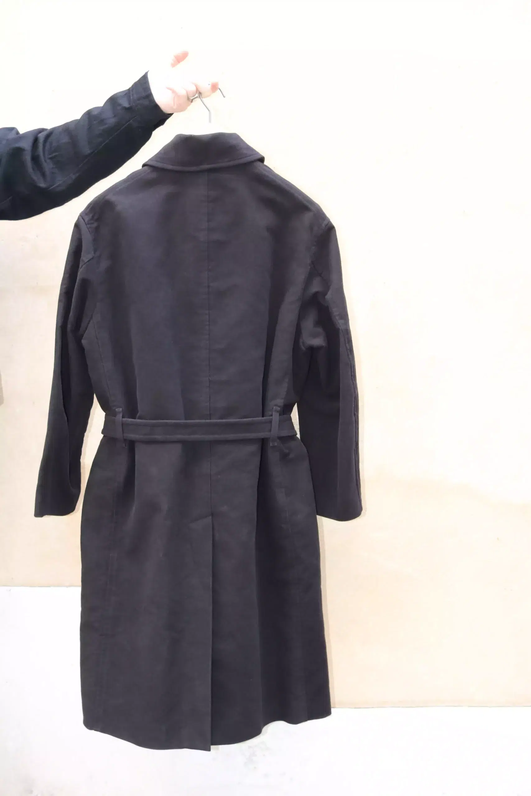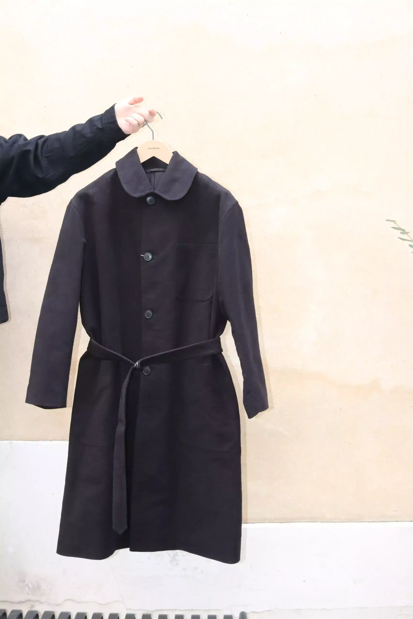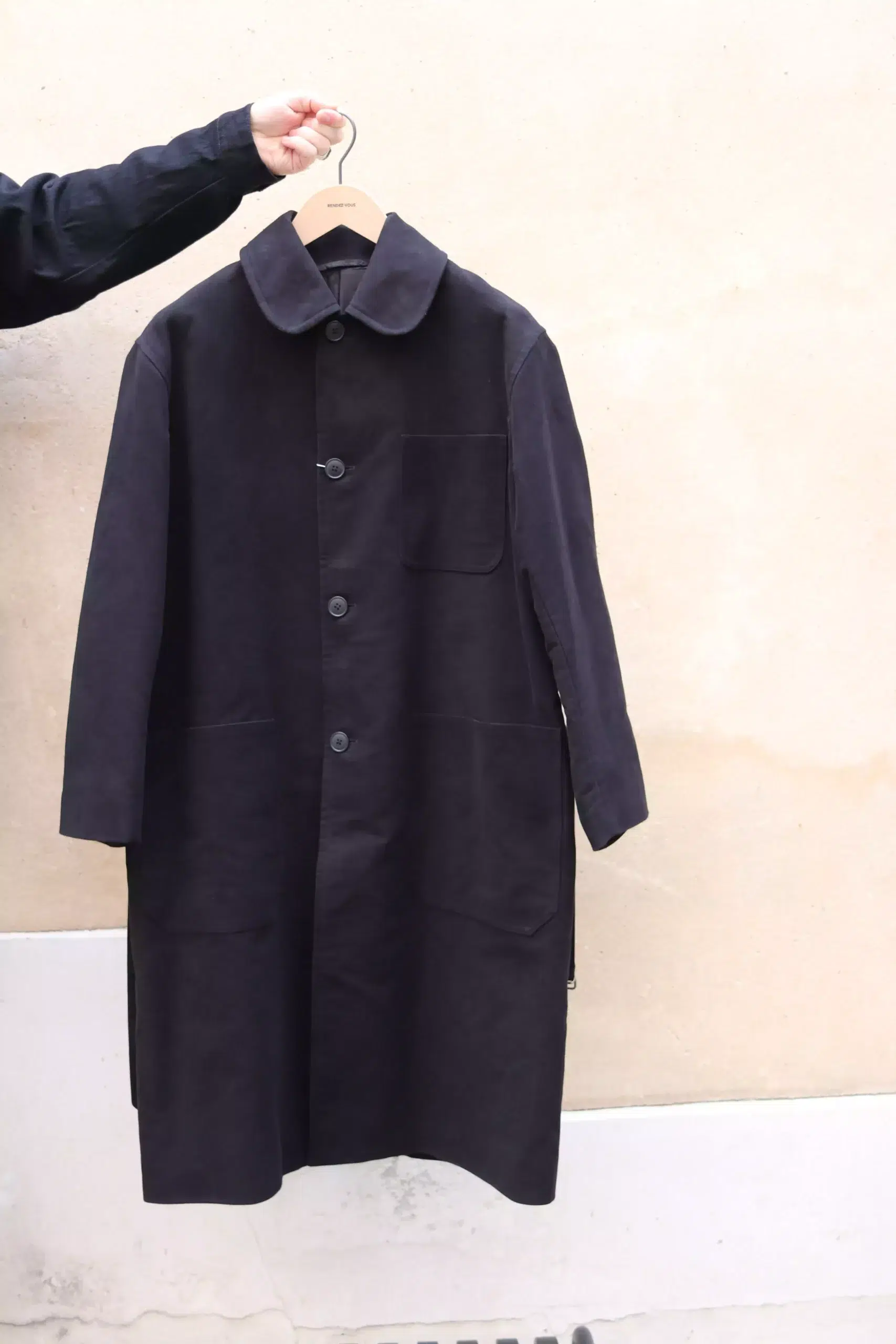This military coat, a carry over item, is made from moleskin this season.