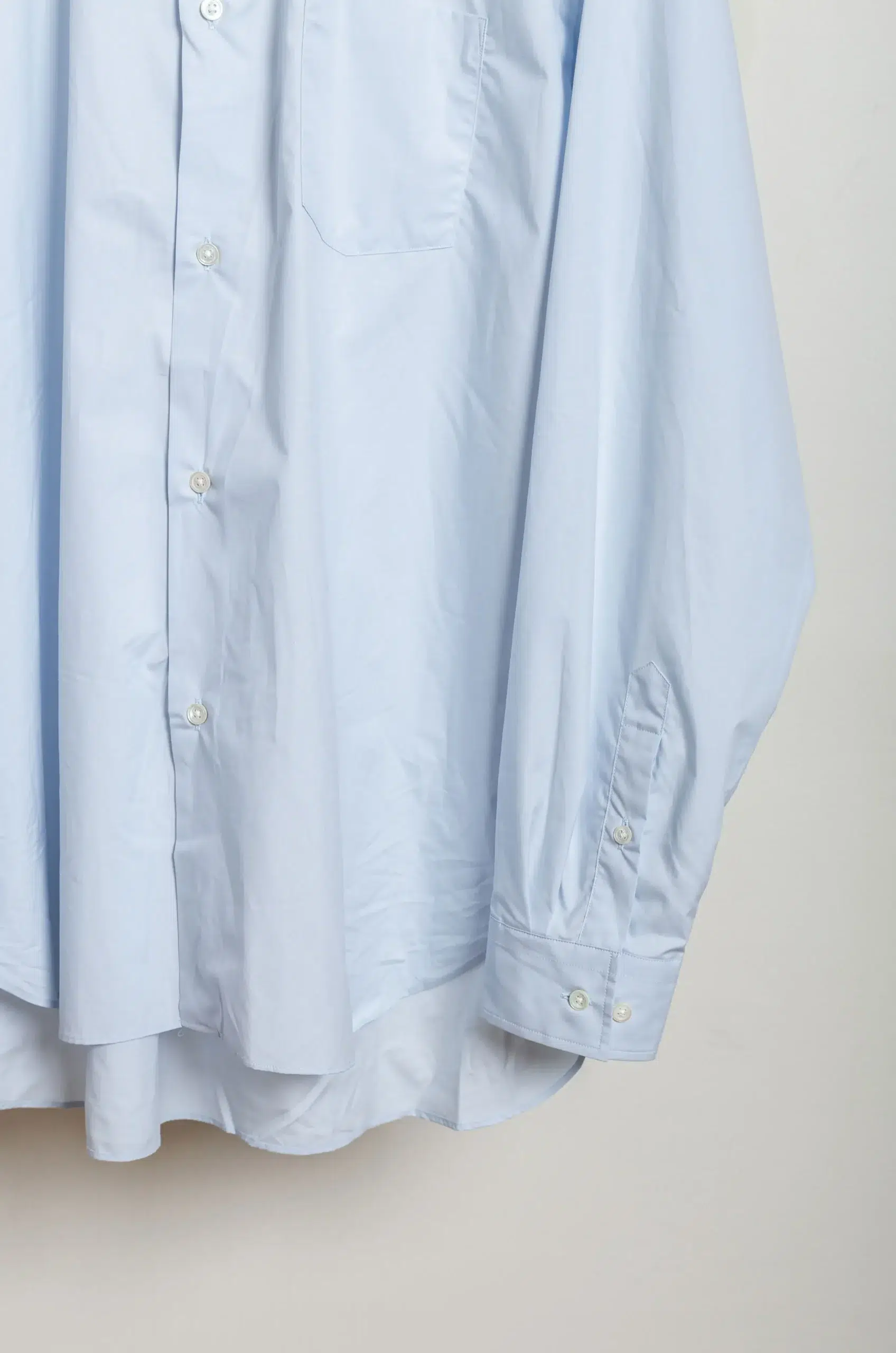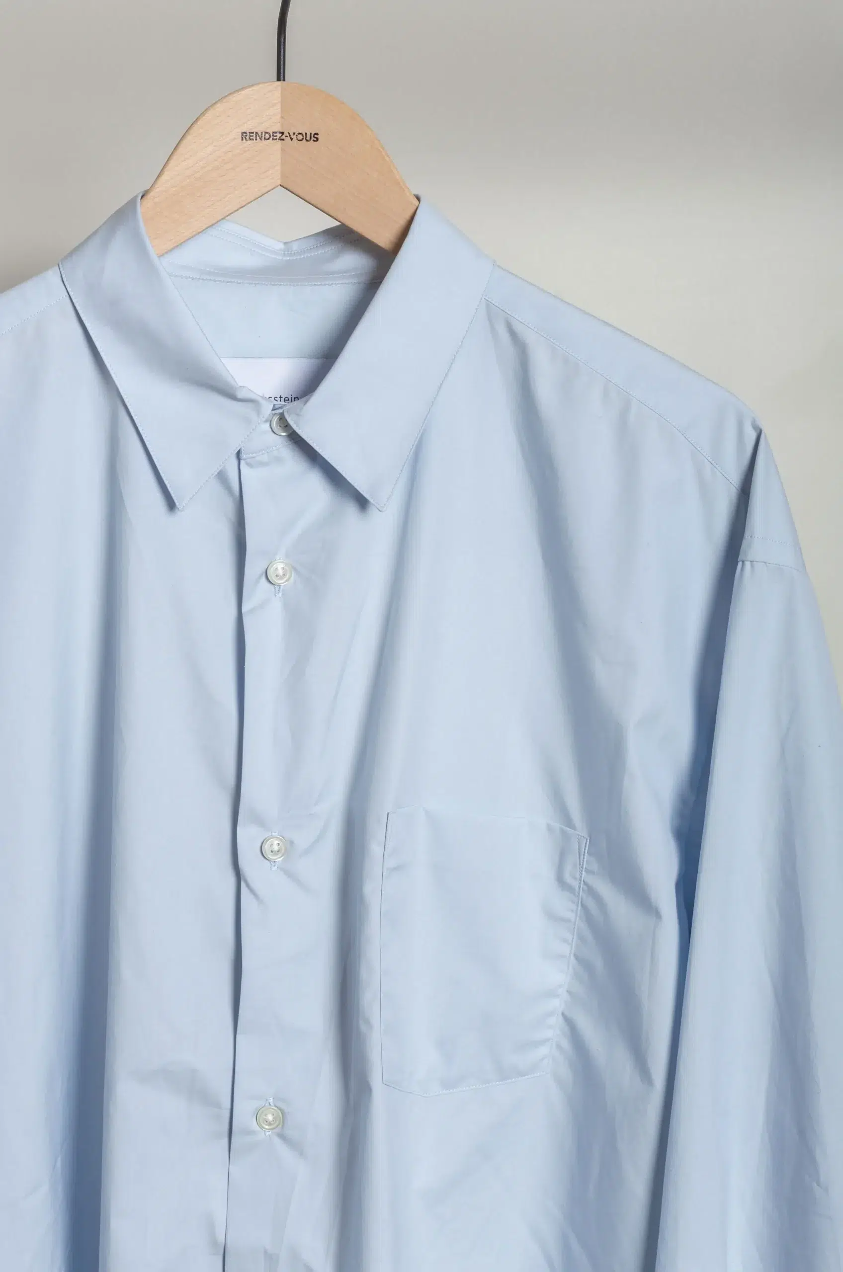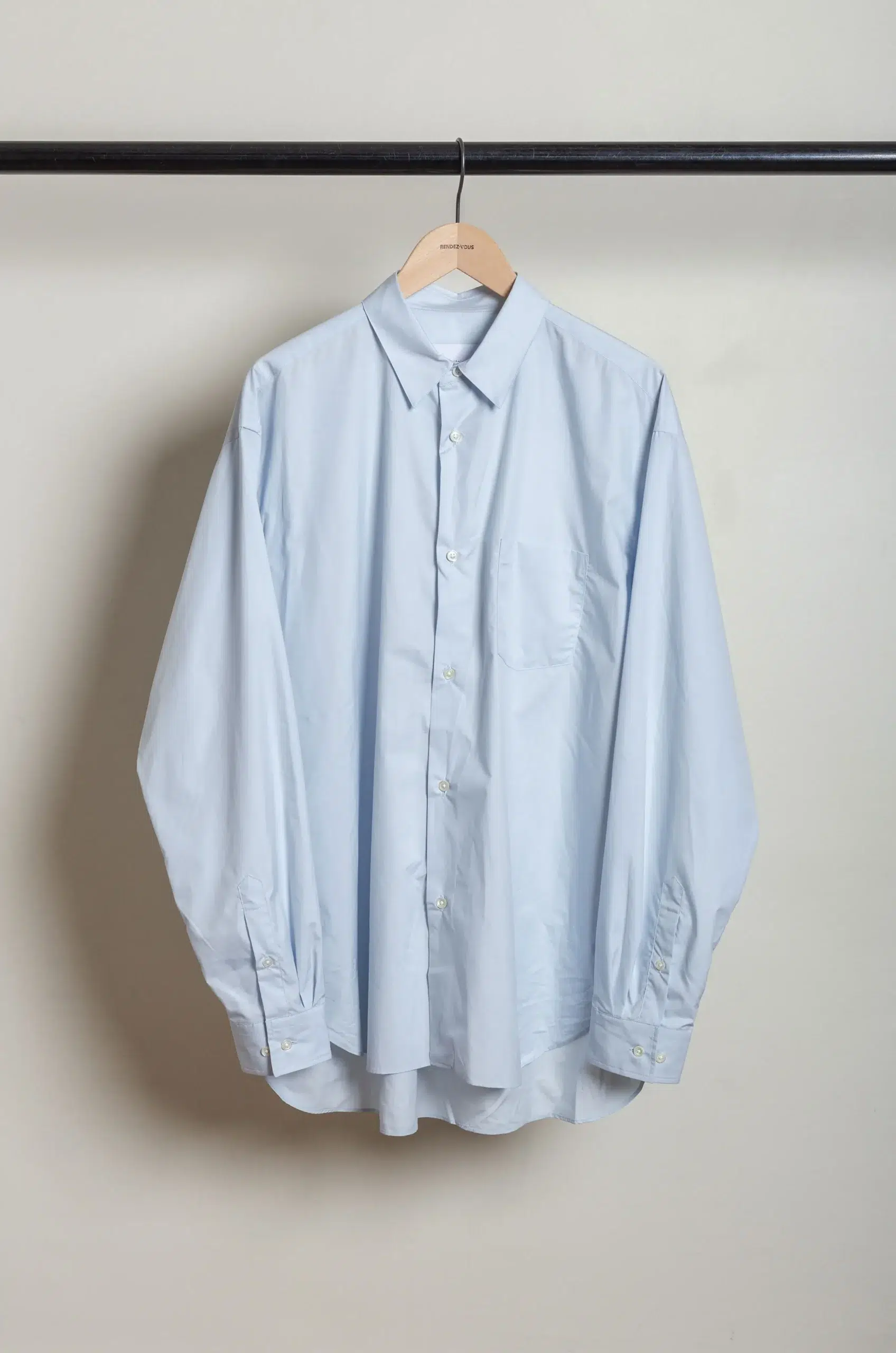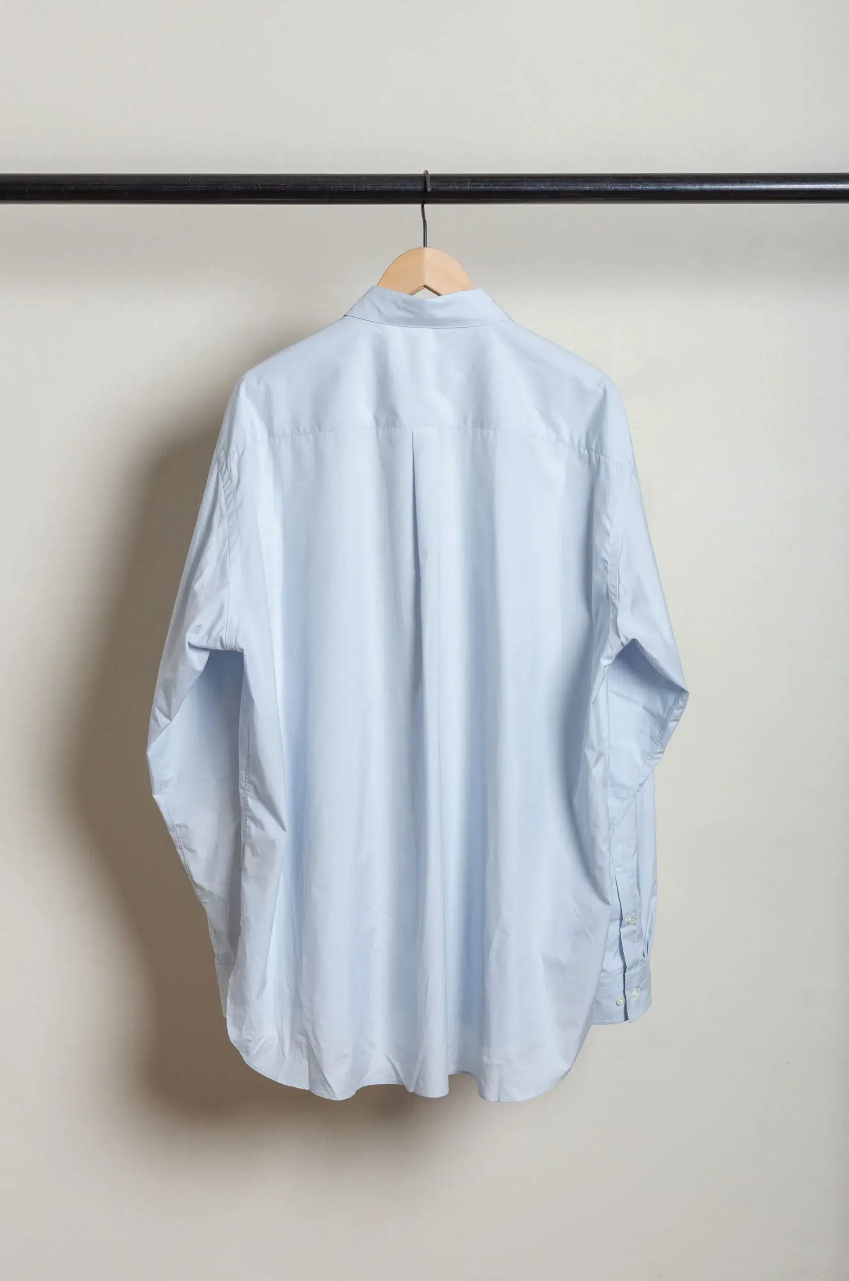 Moreover, the soft off-blue tone enhances the shirt’s contemporary nuance while remaining easy to pair with muted palettes, tonal layers, or, alternatively, stronger contrasts.