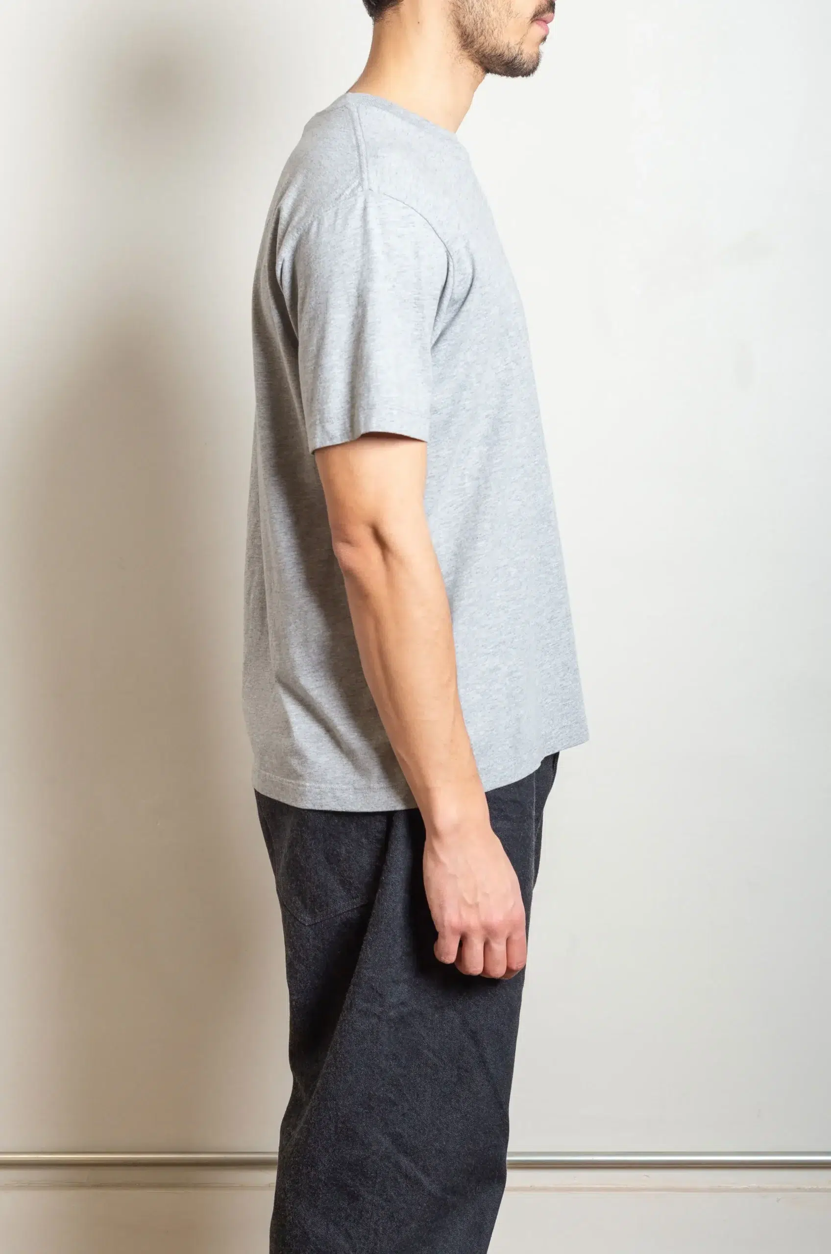 The classic short-sleeve design feels deliberately relaxed yet thoughtfully proportioned, offering a clean line that supports effortless layering. In addition, the precise tailoring of the shoulders and sleeves ensures comfort and visual balance, making the T-shirt suitable for standalone wear or for layering under jackets and sweatshirts. You can wear it casually or as part of a more considered ensemble without compromising either comfort or form.