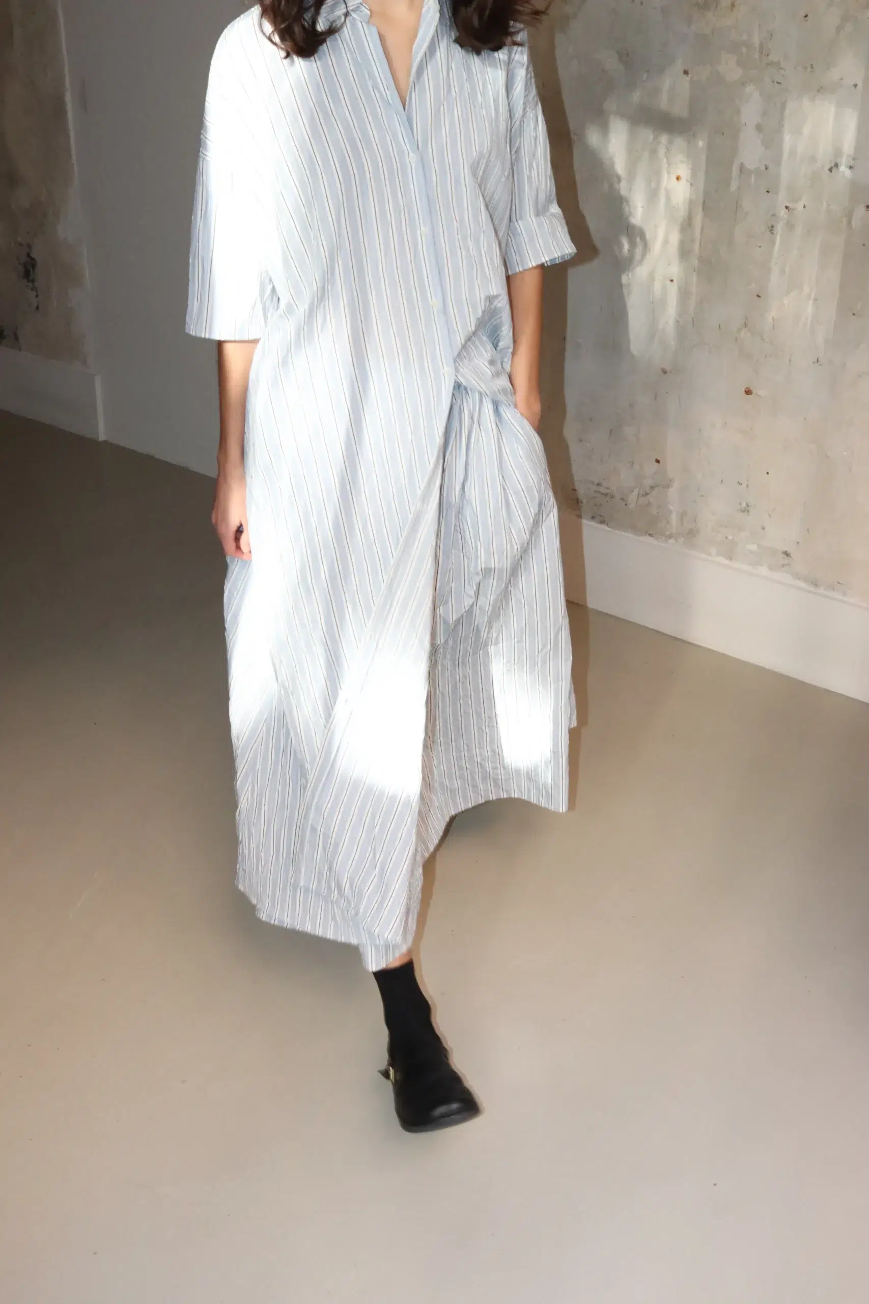 The dress silhouette is relaxed yet thoughtfully tailored, creating a graceful drape that flatters without restricting movement. In addition, the lightweight construction makes it ideal for layering or wearing alone, adapting seamlessly to different seasons and styling combinations.