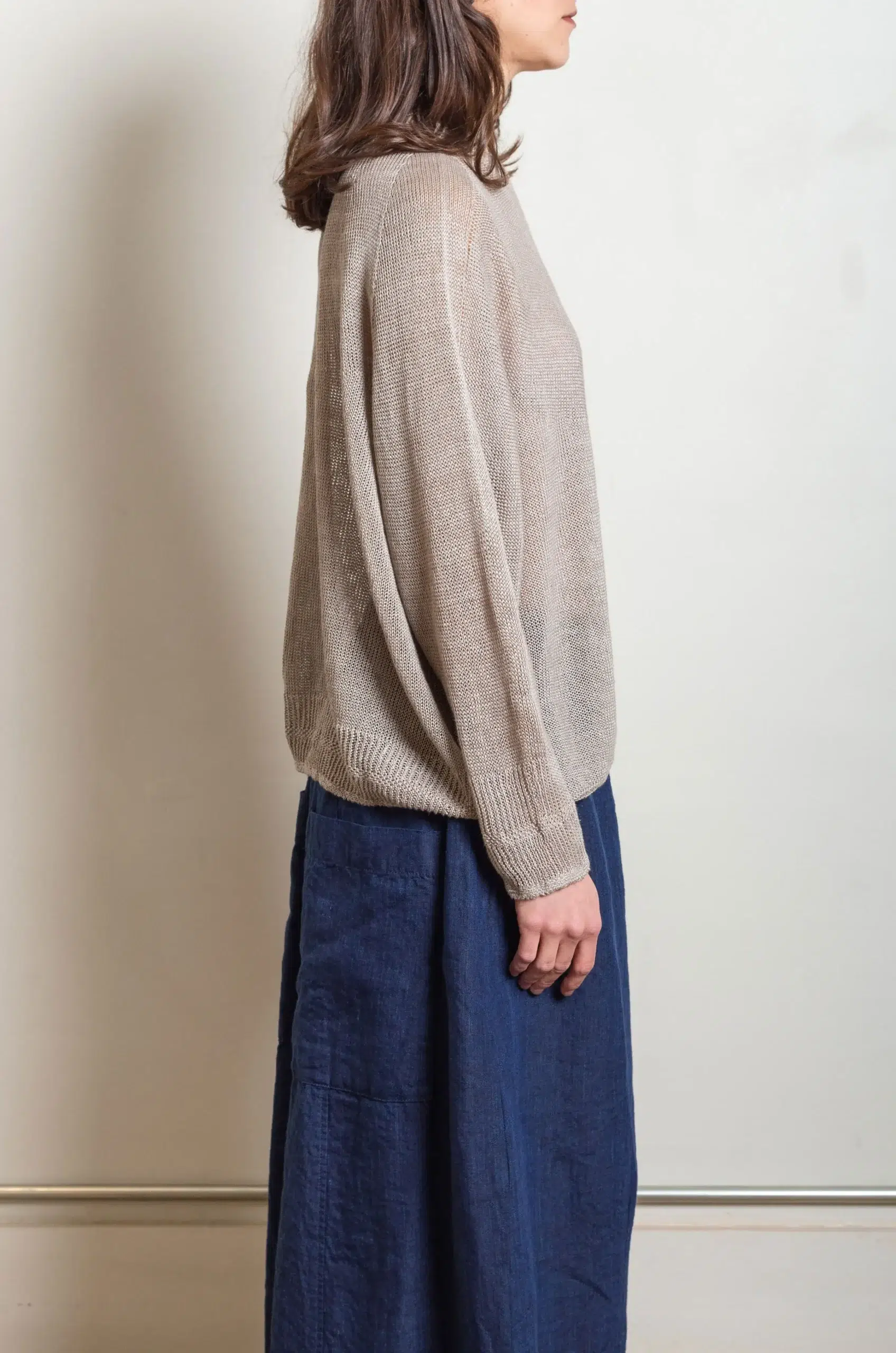 The pullover silhouette appears relaxed yet thoughtfully constructed, allowing fluid movement and a natural drape. In addition, the lightweight structure makes it ideal for layering across seasons, whether styled alone or combined with shirts and outerwear.